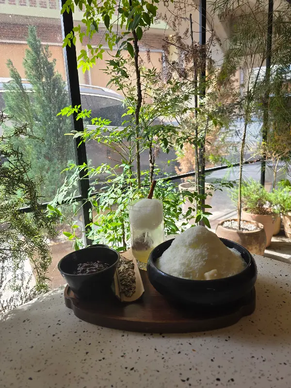 빙수와 함께 제공되는 팥과 견과류는 맛과 식감을 더욱 풍성하게 해준다. 팥의 달콤함과 견과류의 고소함이 소르베와 완벽하게 어우러진다. 양도 푸짐해서 둘이 나눠 먹기에도 충분하다.