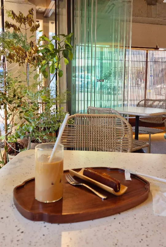 신안소금쌀휘낭시에와 아이스 라떼의 조화. 짭짤하면서도 달콤한 휘낭시에와 시원한 라떼는 완벽한 디저트 타임을 선사한다.