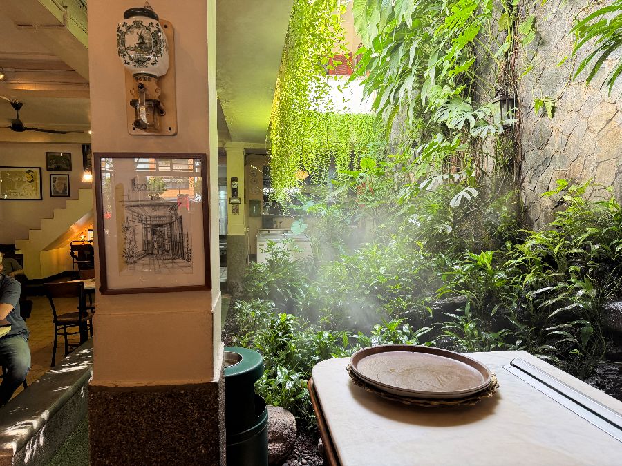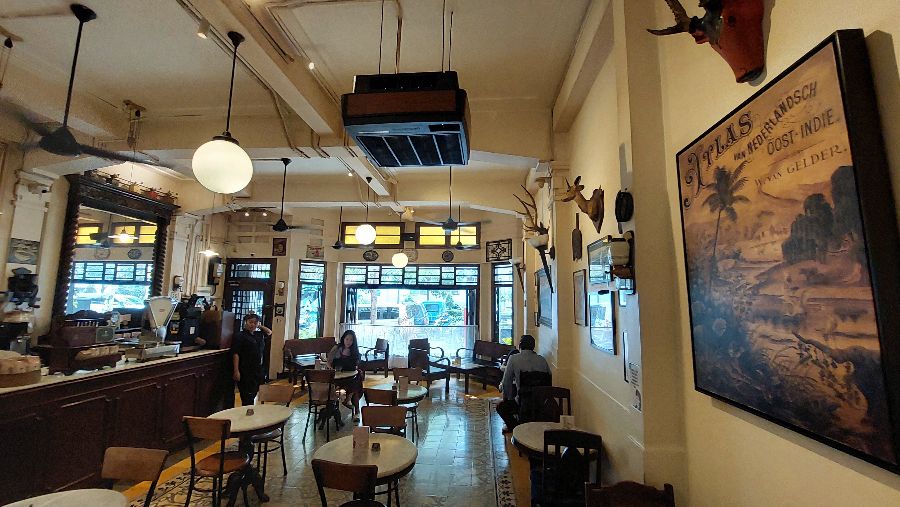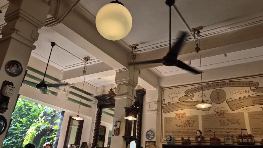 넓은 공간은 방문객들에게 여유로움을 선사하며, 복잡한 도심 속에서 찾아보기 힘든 고요함을 만끽할 수 있게 해줍니다. 천천히 움직이는 실링 팬은 공기를 순환시키며 오래된 건물의 정취를 더하고, 창밖으로 보이는 푸른 식물들은 생동감을 불어넣습니다. 이러한 요소들이 조화를 이루어 바코엘 코피 치키니만의 독보적인 분위기를 완성하며, 방문객들은 이곳에서 진정한 휴식과 사색의 시간을 가질 수 있습니다.