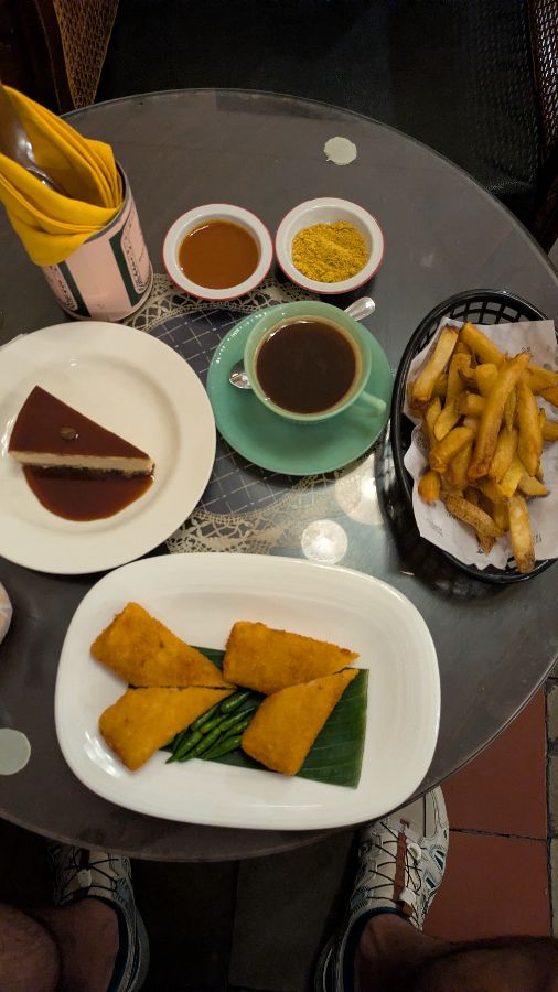 커피, 케이크, 감자튀김, 그리고 인도네시아식 스낵이 한상차림으로 제공된 모습. 다양한 메뉴를 한자리에서 즐길 수 있습니다.