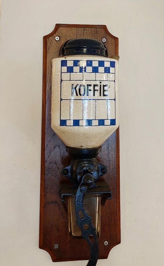 벽에 걸린 앤티크한 커피 그라인더. ‘KOFFIE’라는 글자가 눈길을 끌며 카페의 오랜 역사를 상징합니다.