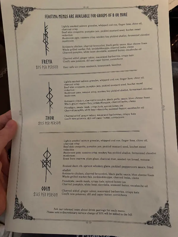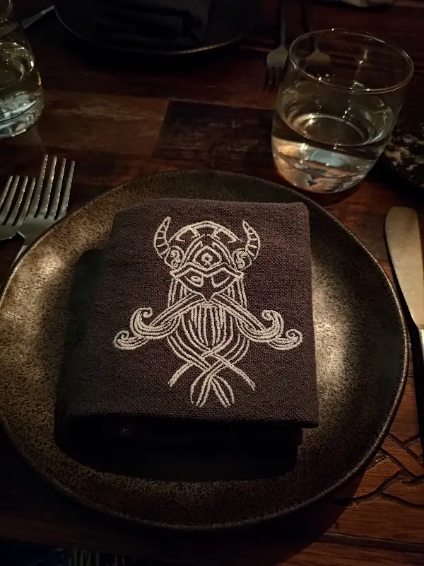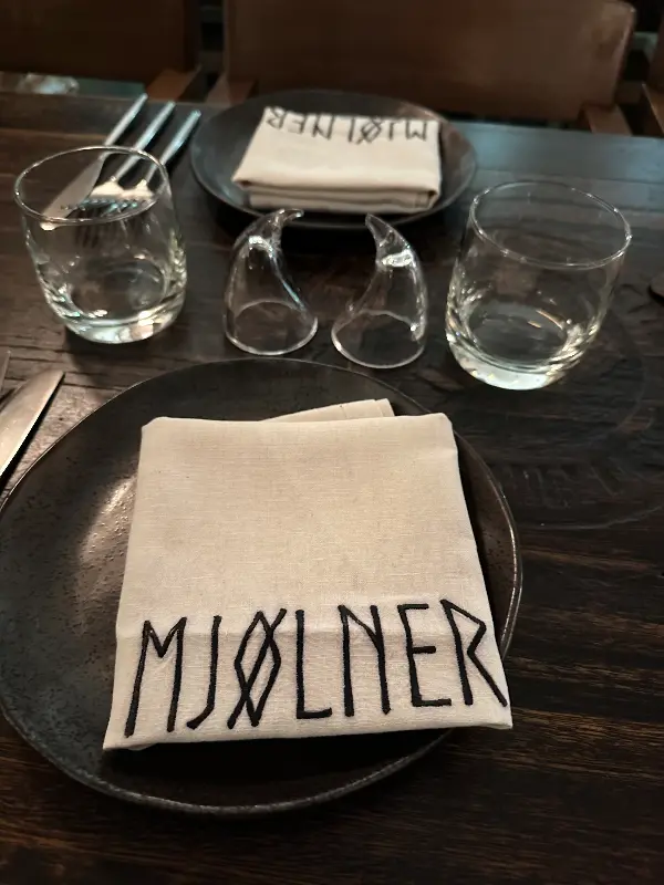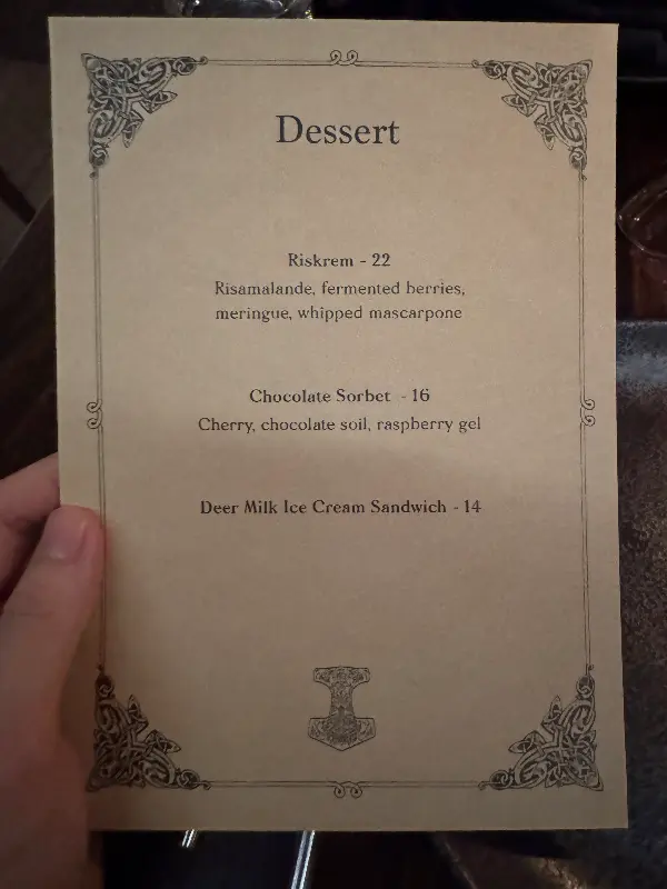 세트 메뉴는 8인 이상 단체만 이용 가능하다는 점은 아쉽지만, 단품 메뉴만으로도 충분히 만족스러운 식사를 즐길 수 있습니다. 메뉴판 디자인 또한 바이킹 컨셉에 충실하여, 룬 문자와 바이킹 문양으로 장식되어 있습니다. 디저트 메뉴로는 리스크렘(Riskrem)이 특히 인기가 높습니다. 리스크렘은 쌀, 아몬드, 베리, 휘핑크림으로 만들어진 노르웨이 전통 디저트로, 묠니르에서는 독특한 스타일로 재해석하여 제공합니다.