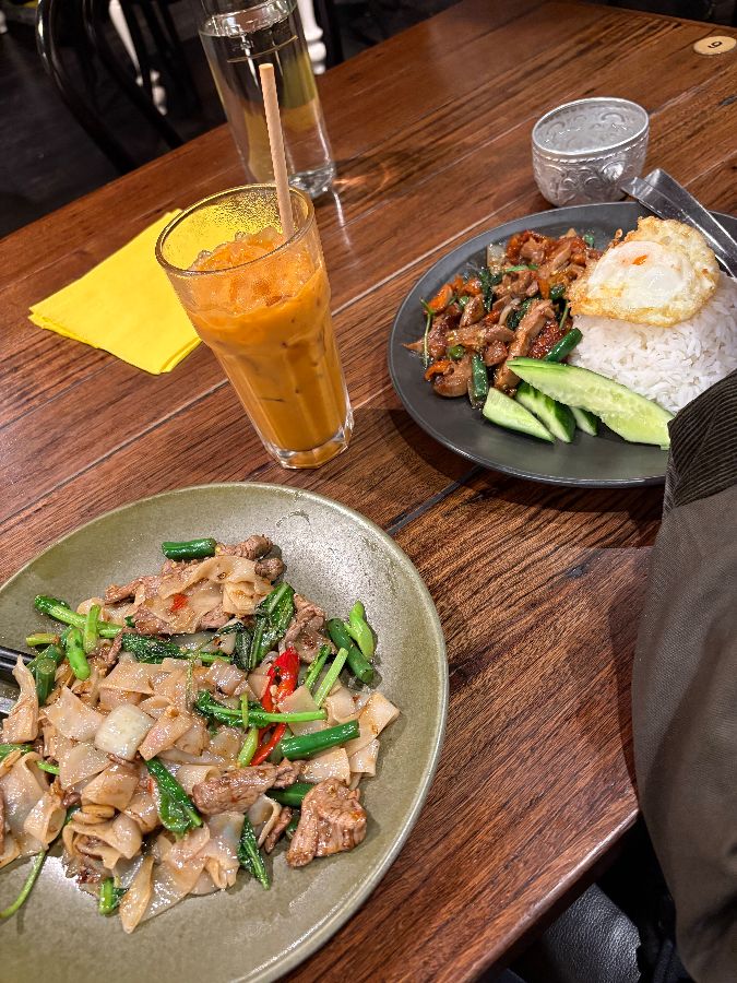 테이블에 놓인 타이 밀크티와 태국 요리들이 테이블 위에서 따뜻한 분위기를 연출하고 있습니다.