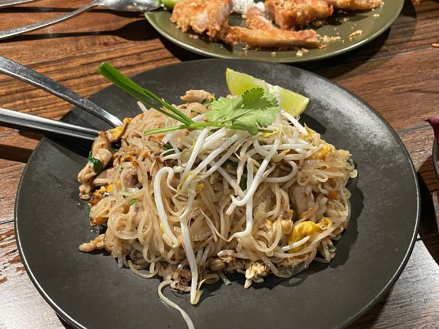레몬 조각이 곁들여진 팟타이. 면발의 윤기가 식욕을 자극합니다.