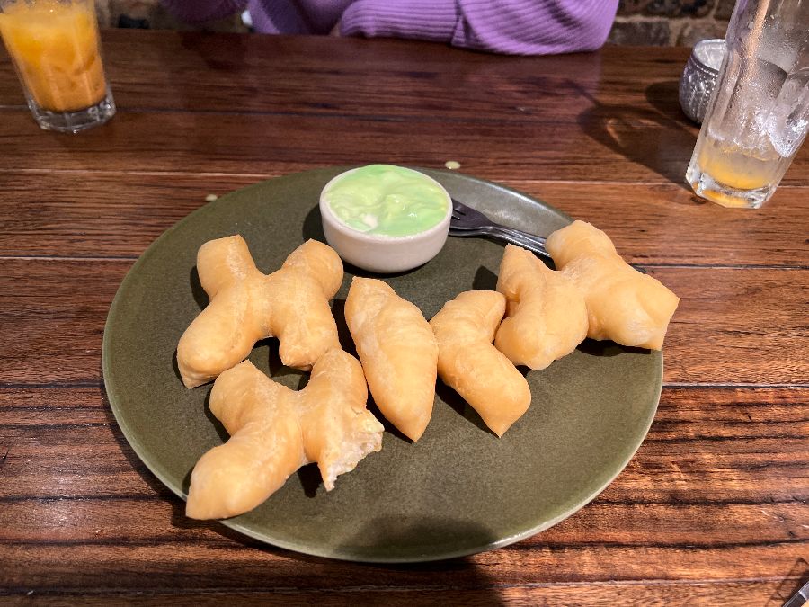 바삭하게 튀겨진 ‘Par thung go’와 함께 제공되는 연두색 소스.
