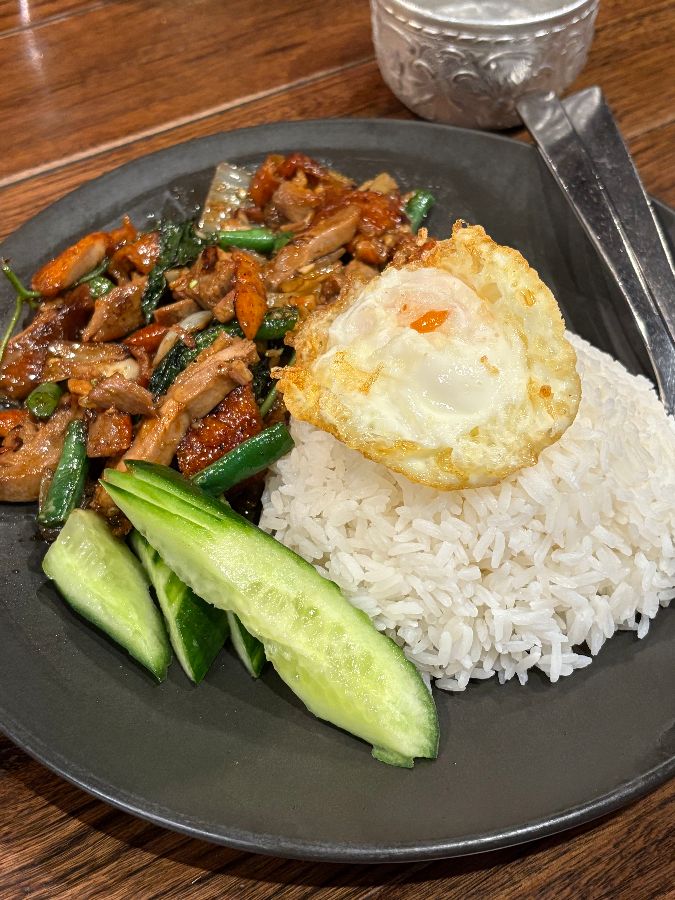 매콤한 양념에 볶아진 닭고기와 채소, 그리고 밥이 한 그릇에 담긴 태국식 덮밥.