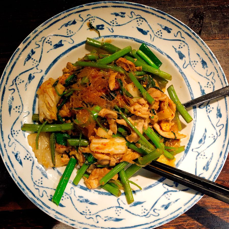 큼지막한 닭고기와 면, 채소가 어우러진 볶음 요리. 면발의 윤기가 살아있습니다.