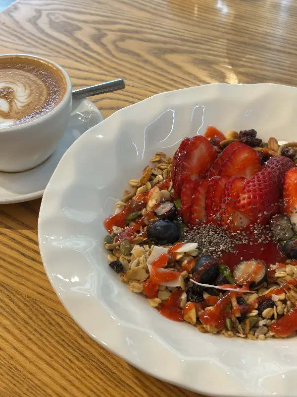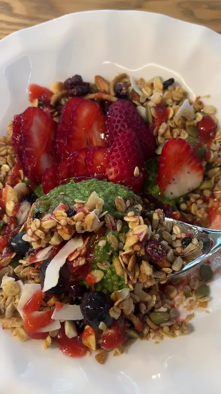 신선한 재료들이 듬뿍 들어간 브런치는 눈으로도 즐겁다. 촉촉한 딸기와 바삭한 견과류의 조화!