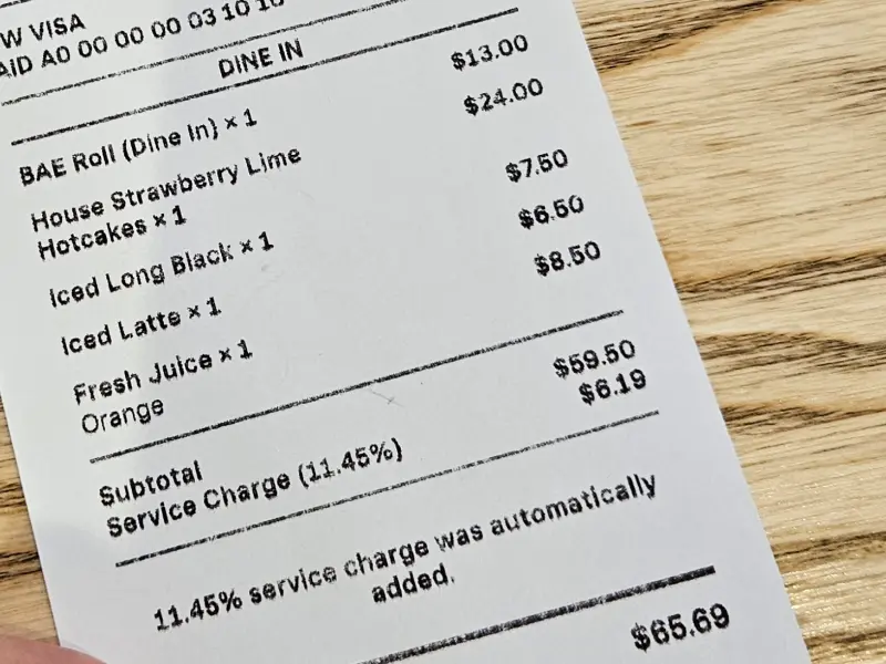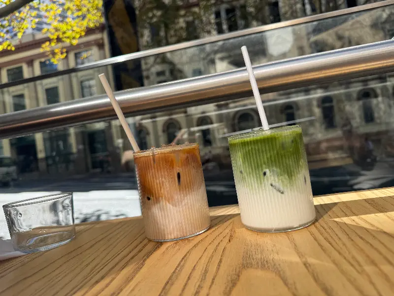마침 창가 자리가 비어 있어 그곳에 앉았다. 투명한 유리창 너머로 보이는 촉촉한 시드니의 아침 풍경은, 왠지 모르게 마음을 차분하게 만들어 주는 묘한 매력이 있었다. 빗소리를 배경음악 삼아 메뉴를 고르는 시간은 그 자체로 힐링이었다. 나무 테이블 위에 놓인 물병과 컵마저도 따뜻한 감성을 더했다.