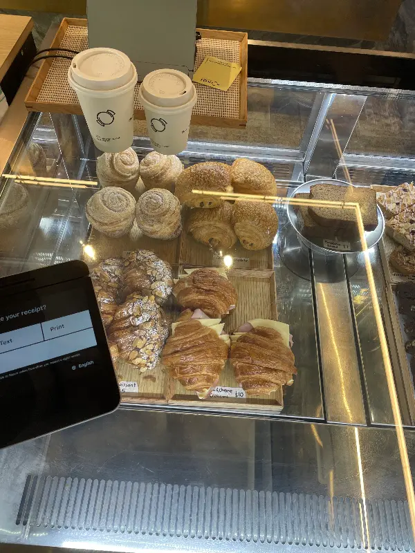 아몬드 크루아상 역시 훌륭한 선택이었다. 너무 달지도 않고 아몬드 크림이 듬뿍 들어 있어, 커피와 함께 즐기기에 완벽했다. 쇼케이스 안에 진열된 다양한 빵과 디저트들은 하나같이 먹음직스러워 보였다. 다음에는 다른 메뉴도 꼭 맛봐야겠다는 생각이 들었다.