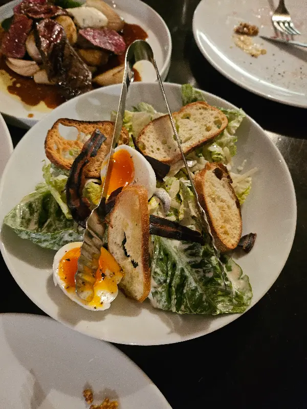 신선한 채소와 바삭한 빵, 반숙 계란이 조화롭게 어우러진 샐러드는 식전에 입맛을 돋우기에 충분합니다.