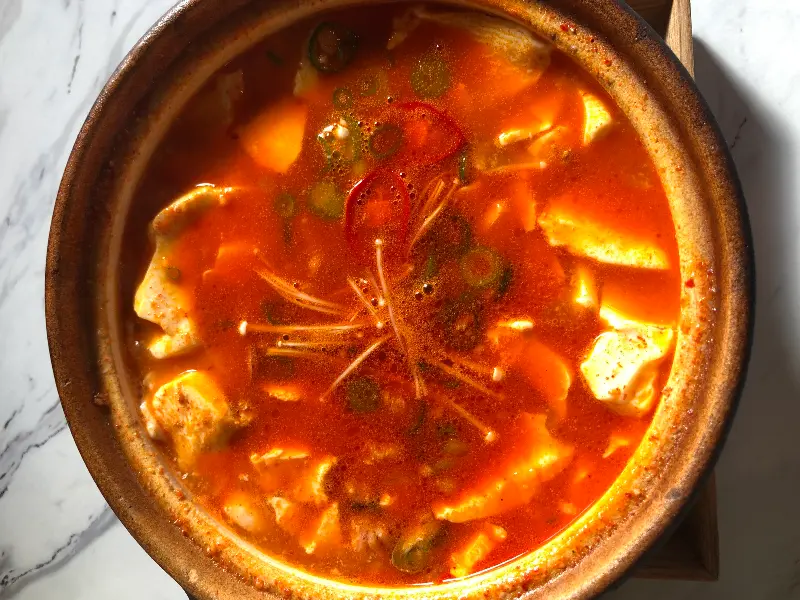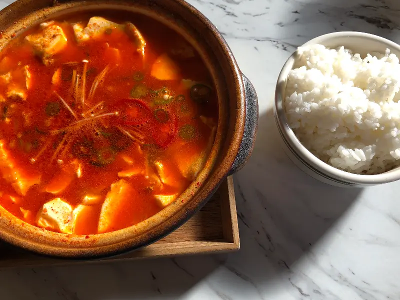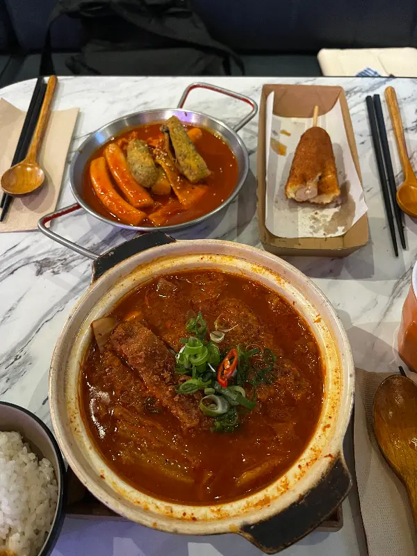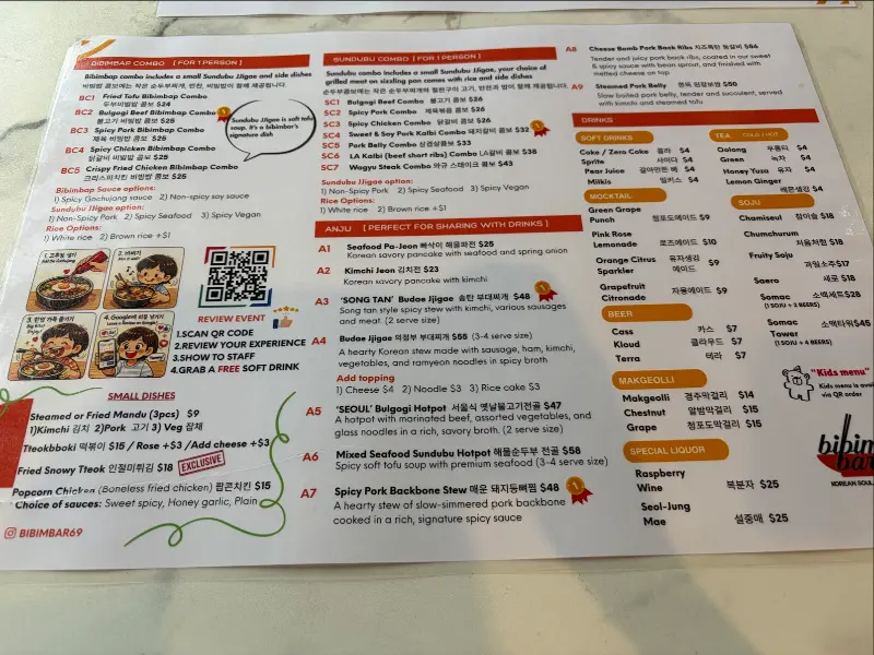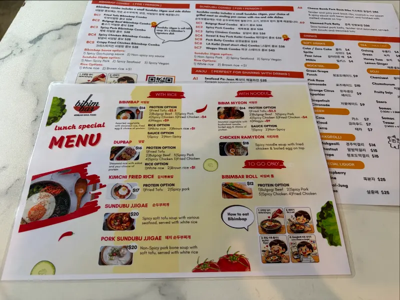 메뉴판을 펼쳐 들자, 다양한 한식 메뉴들이 눈길을 사로잡았다. 비빔밥, 순두부찌개, 김밥, 떡볶이… 고민 끝에 가장 기본적이면서도 그리웠던 비빔밥과 순두부찌개를 주문했다. 잠시 후, 테이블 위에 차려진 음식들을 보니 절로 미소가 지어졌다.