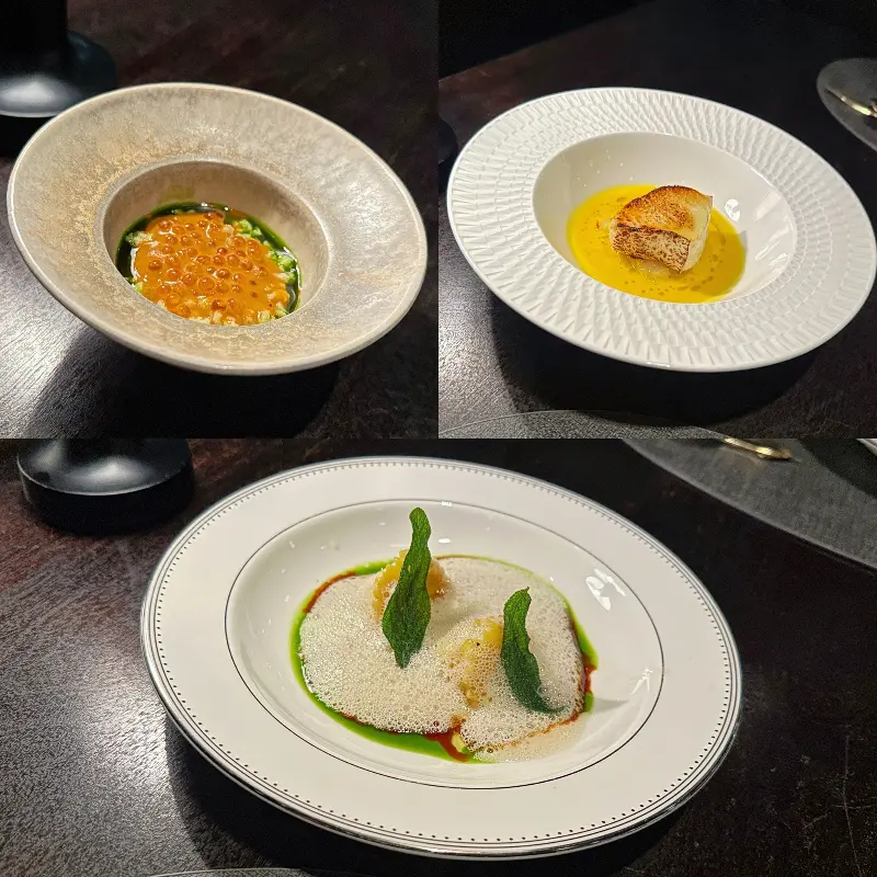 섬세한 손길로 완성된 요리들은 마치 한 폭의 그림처럼 아름다웠다. 옅은 갈색 접시에 담긴 요리는 황금빛 연어알과 초록색 허브 오일이 조화롭게 어우러져 식욕을 자극했고, 흰색 접시 위의 노란 호박 수프는 바삭하게 구워진 빵 조각과 함께 따뜻한 분위기를 자아냈다. 테이블 위에 놓인 접시들은 단순한 식기가 아닌, 요리의 아름다움을 더욱 돋보이게 하는 캔버스 역할을 했다.