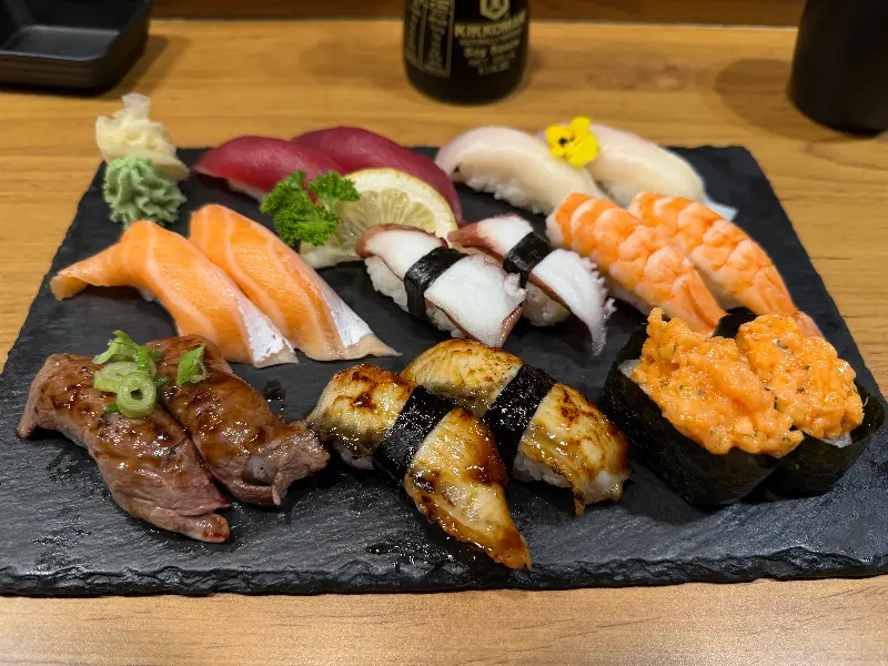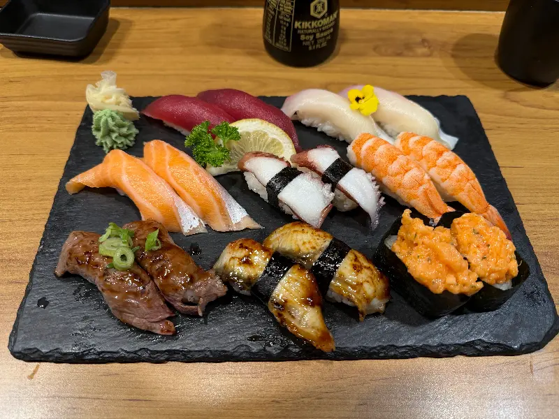 드디어 주문한 음식이 나왔다. 먼저 눈에 들어온 것은 신선한 재료들이었다. 윤기가 흐르는 사시미와 밥알 하나하나가 살아있는 듯한 스시의 모습은 보기만 해도 군침이 돌았다. 특히, 구운 와규 니기리는 겉은 살짝 익고 속은 촉촉한 완벽한 조화를 이루고 있었다.