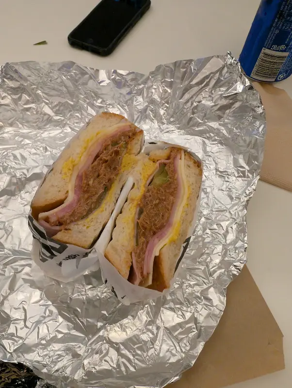 수많은 샌드위치 중에서 나의 선택은 ‘쿠바노’였다. 리뷰에서 극찬이 자자했던 메뉴였기에 망설임 없이 골랐다. 주문 후 얼마 지나지 않아 따끈한 쿠바노 샌드위치가 내 손에 들려졌다. 샌드위치를 감싼 종이를 열자, 먹음직스러운 비주얼이 눈앞에 펼쳐졌다. 노릇하게 구워진 빵 사이로 돼지고기, 햄, 피클이 층층이 쌓여 있었고, 훈제 향이 코를 자극했다.