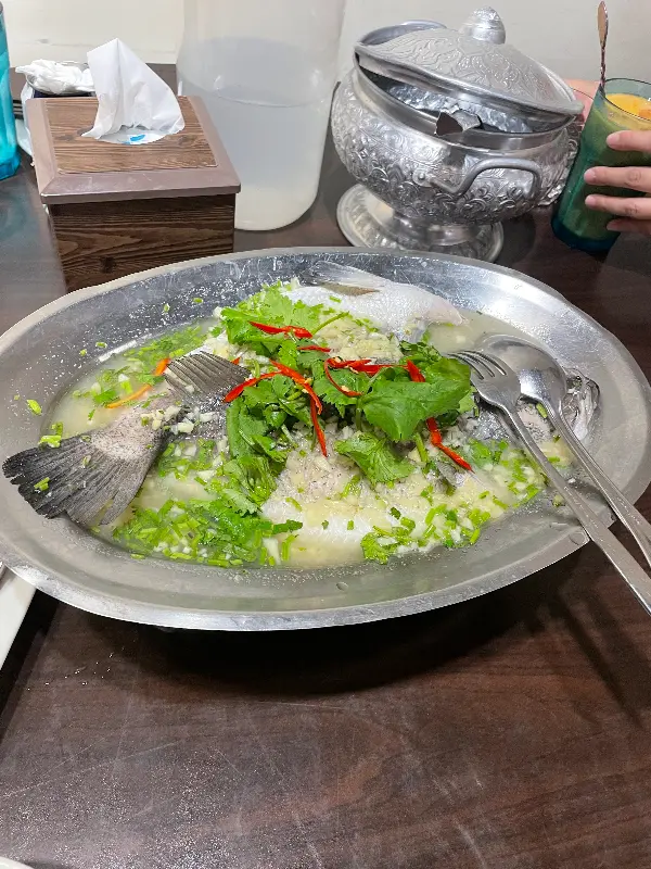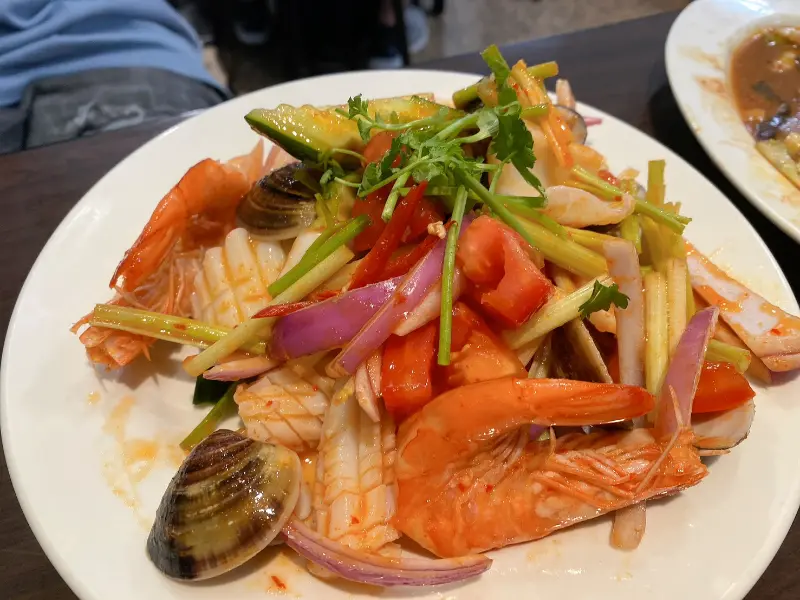 메뉴판을 펼쳐 들자, 다채로운 태국 요리의 향연이 펼쳐진다. 6인 세트 메뉴를 주문하니, 가장 먼저 등장한 것은 보기만 해도 침샘을 자극하는 똠얌 수프였다. 붉은 빛깔의 국물은 매콤하면서도 새콤하고, 깊은 풍미가 느껴진다. 한 모금 들이키는 순간, 온몸에 퍼지는 따뜻함과 함께 태국 특유의 향신료 향이 입안 가득 퍼져 나간다.