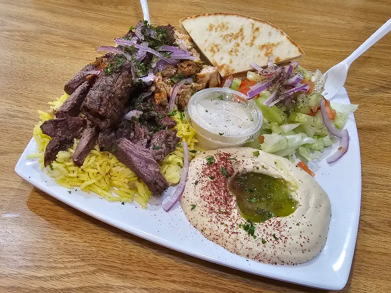 다채로운 구성이 돋보이는 믹스 플레이트. 고기, 샐러드, 후무스, 피타빵까지 한 번에 즐길 수 있습니다.