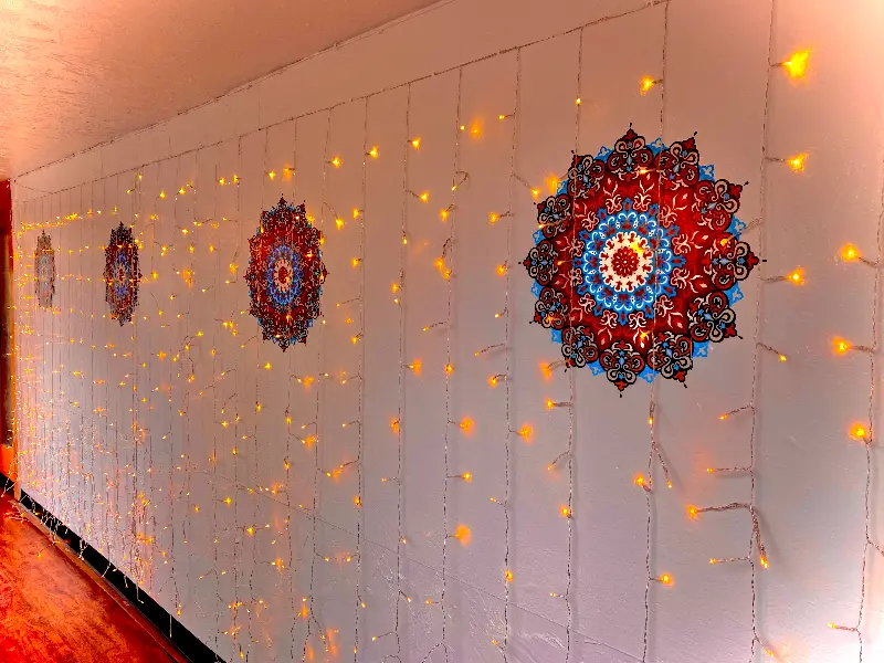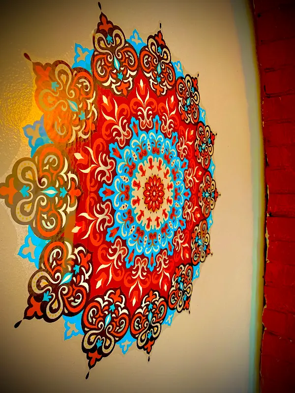 매장 안으로 들어서자, 가장 먼저 눈에 띄는 것은 붉은 벽돌로 만들어진 아치형 입구였습니다. 마치 다른 세계로 통하는 문처럼, 신비로운 분위기를 자아냈습니다. 벽에는 화려한 문양이 그려져 있었는데, 자세히 보니 정교한 만다라였습니다. 낯선 듯하면서도 어딘가 익숙한 느낌이었습니다.