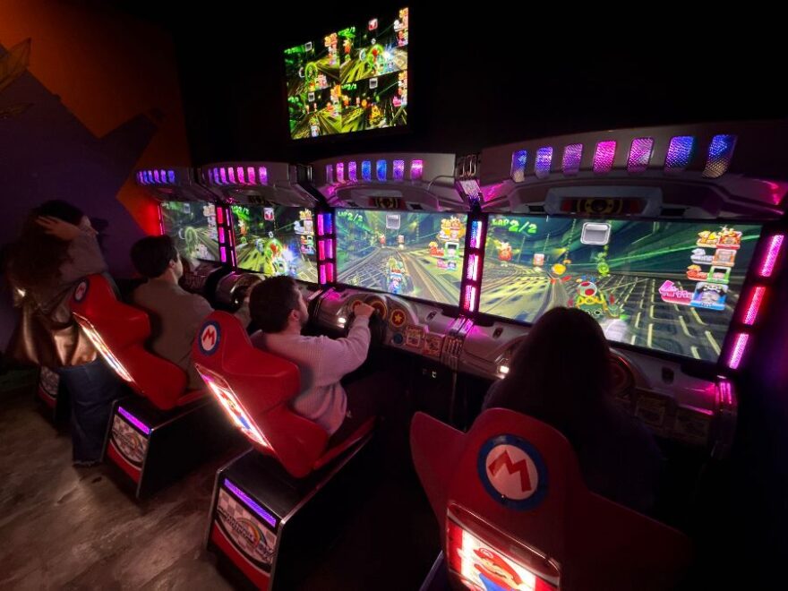 이미지 속 사람들은 마리오 카트 아케이드 게임에 푹 빠져 있습니다. 붉은색 좌석에 앉아 핸들을 잡고 있는 모습에서 어린아이 같은 즐거움이 느껴집니다. 게임 화면에서는 익숙한 캐릭터들이 트랙을 질주하고 있습니다. 네온 불빛이 반사되는 게임기는 향수를 자극하며, 마치 시간 여행을 떠나온 듯한 기분을 선사합니다.