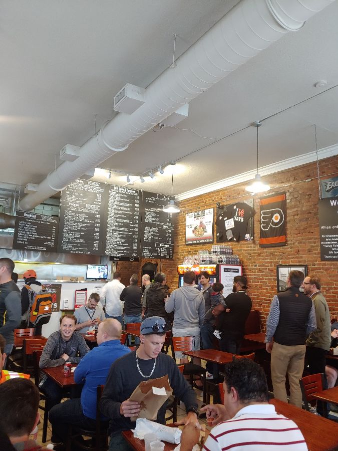저 역시 처음에는 12인치에 도전할까 고민했지만, 주변 사람들의 만류에 굴복하여 8인치 치즈 스테이크를 주문했습니다. 주문 후 잠시 기다리는 동안, 가게 안을 둘러보았습니다. 벽돌 벽에는 Tat’s Delicatessen의 역사를 보여주는 듯한 사진과 포스터들이 붙어 있었고, 천장에는 커다란 환풍기가 돌아가고 있었습니다. 활기찬 분위기 속에서 샌드위치를 기다리는 시간은 지루할 틈이 없었습니다.