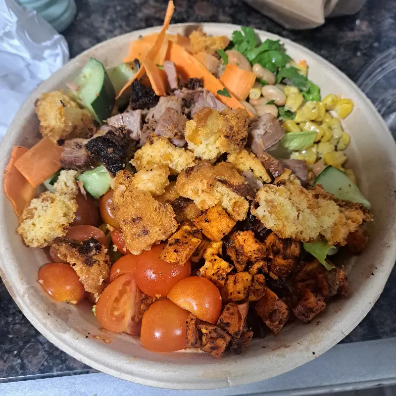 “스모크하우스 하베스트 볼”이라는 샐러드도 맛보았다. 신선한 채소와 훈연한 고기, 다양한 토핑이 어우러진 샐러드는 건강하면서도 맛있는 한 끼 식사로 제격이었다. 특히 텍사스 토마토 드레싱은 살짝 매콤하면서도 상큼한 맛이 일품이었다. 양지머리가 약간 기름지긴 했지만 드레싱이 느끼함을 잡아주어 환상적인 궁합을 자랑했다.