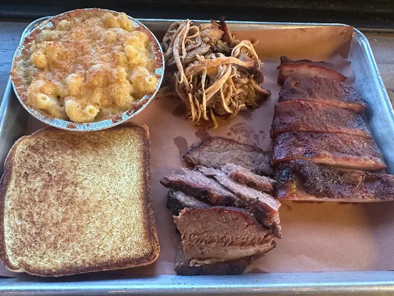 샘플러 플래터에는 브리스킷, 풀드 포크, 립, 맥앤치즈, 코울슬로가 함께 나온다. 보기만 해도 푸짐한 양에 절로 미소가 지어진다. 훈연 향이 코를 간지럽히고, 윤기가 좌르르 흐르는 바비큐의 모습은 정말이지 황홀했다.