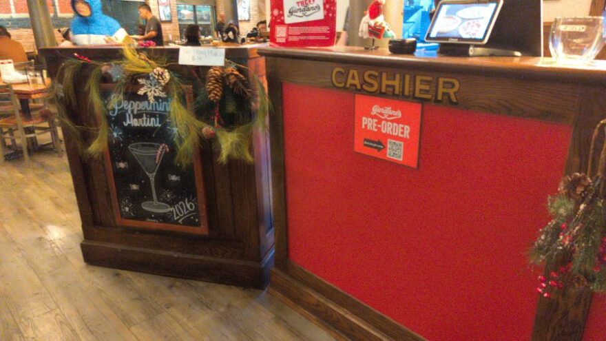 이미지에서 보이는 것처럼, 카운터는 따뜻한 나무 소재로 꾸며져 있었고, 크리스마스 장식이 더해져 아늑한 분위기를 자아냈습니다. 벽돌 벽에는 “WE MAKE THE WORLD’S BEST PIZZA”라는 문구가 적힌 액자가 걸려 있어, 피자에 대한 자부심을 엿볼 수 있었습니다.