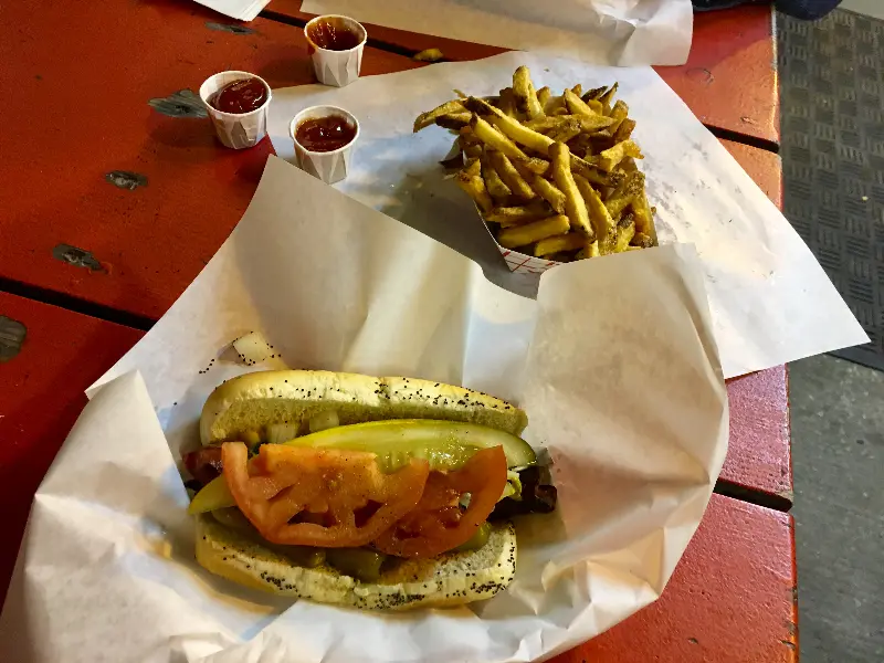 시카고 당일치기 여행 중 우연히 들른 이곳에서 숯불 핫도그를 맛보게 된 건 행운이었다. 핫도그는 물론, 함께 제공되는 다른 재료들의 신선함도 훌륭했다. 특히 핫도그와 함께 곁들여 먹은 감자튀김은 이번 여행에서 먹었던 것 중 단연 최고였다! 겉은 바삭하고 속은 촉촉한 완벽한 식감에, 짭짤하면서도 고소한 맛이 일품이었다. 핫도그를 주문할 때 감자튀김을 빼놓으면 후회할지도 모른다.