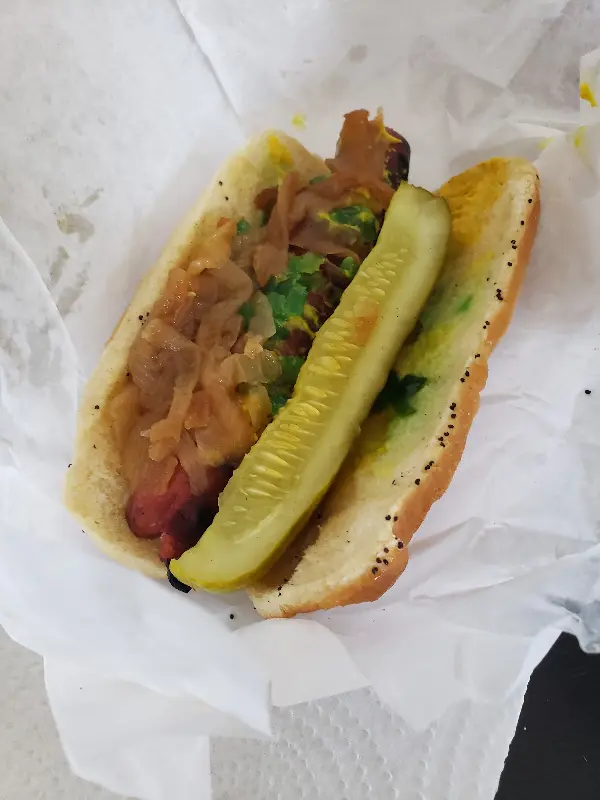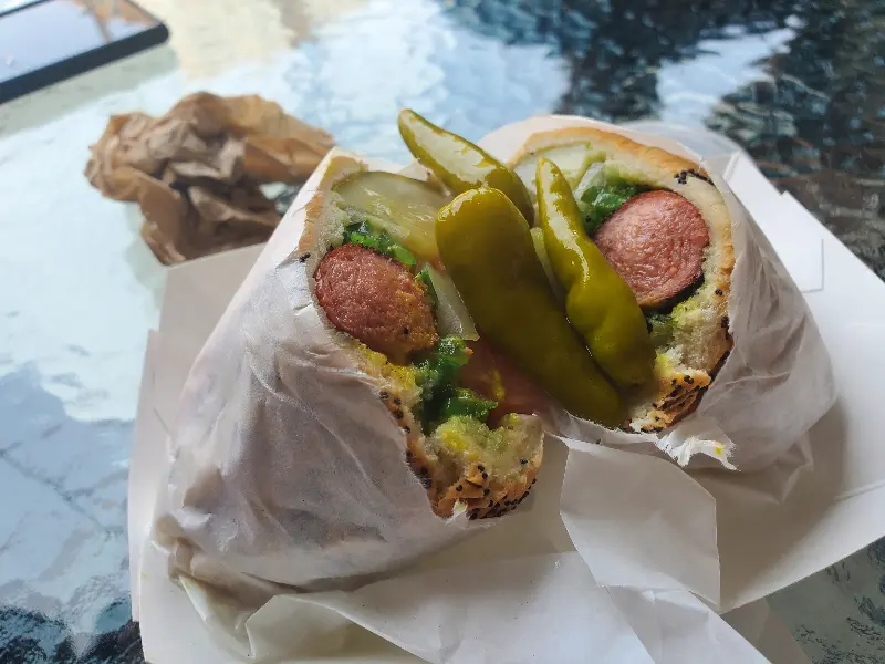 나는 완벽하게 양념되고 전통적인 토핑이 가득 얹어진 클래식 시카고 스타일 핫도그를 주문했다. 한 입 베어 무는 순간, 입안에서 펼쳐지는 맛의 향연! 톡톡 터지는 소시지의 육즙, 아삭아삭한 채소의 신선함, 그리고 빵의 고소함이 완벽하게 어우러졌다. 특히, 신선한 토마토와 아삭한 오이 피클은 핫도그의 느끼함을 잡아주면서 입안을 상쾌하게 만들어 주었다. 약간 기름진 맛이 느껴졌지만, 오히려 그것이 이 핫도그의 매력이라는 생각이 들었다.