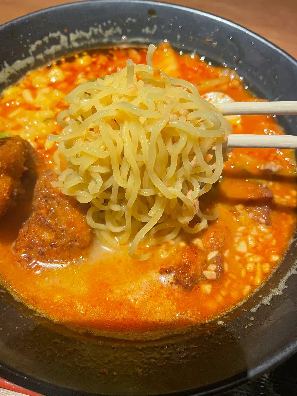 드디어 라멘이 나왔다. 붉은 빛깔의 국물 위에 김치와 카라아게가 푸짐하게 올려져 있었다. 겉보기에는 다소 낯선 조합이었지만, 코를 찌르는 매콤한 향이 식욕을 자극했다. 젓가락으로 면을 들어올리니, 탱글탱글한 면발이 시선을 사로잡았다.