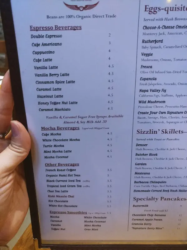 자리에 앉아 메뉴판을 펼쳐 들었습니다. 정말 다양한 메뉴에 눈이 휘둥그레졌습니다. 팬케이크 종류만 해도 수십 가지는 되는 것 같았어요. Specialty Pancakes부터 All-Natural Grade AA Eggs, Specialty Benedicts, 그리고 Sizzlin’ Skillets까지, 메뉴 하나하나가 다 맛있어 보여서 고민이 깊어졌습니다. 메뉴판을 미리 보고 와야겠다는 생각이 들 정도였어요!