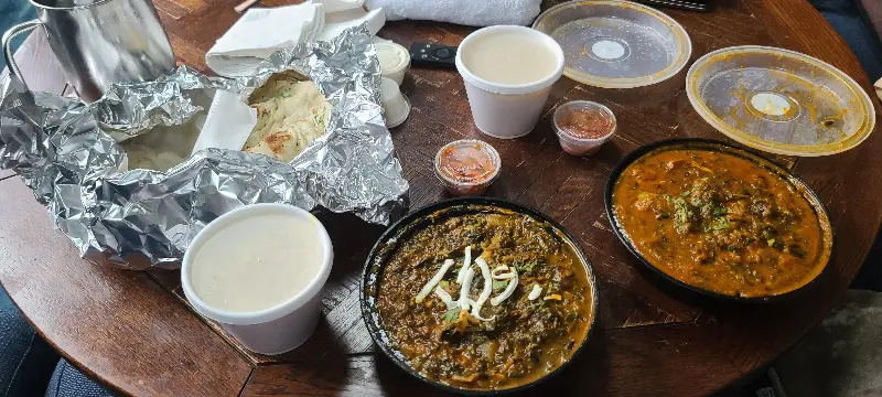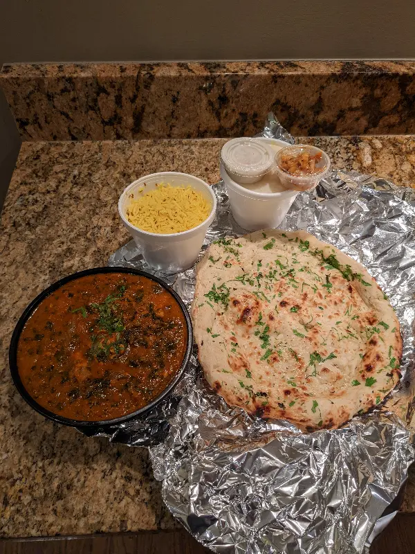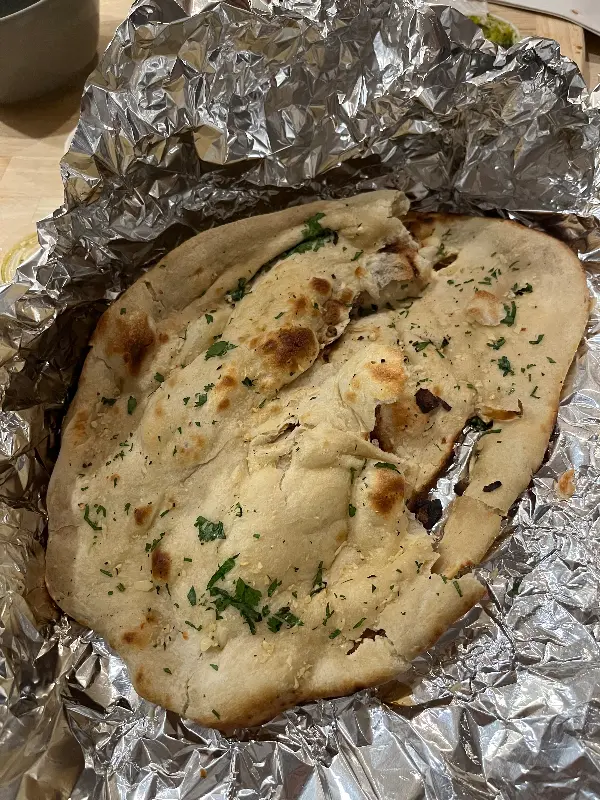 드디어 주문한 음식이 나왔습니다. 따뜻한 갈릭 난은 은박지에 정성스럽게 포장되어 있었고, 은은한 마늘 향이 코를 간지럽혔습니다. 겉은 바삭하고 속은 촉촉한 난은 보기만 해도 군침이 돌았습니다. 함께 주문한 치킨 사그는 짙은 녹색 빛깔을 뽐내며, 풍부한 향신료 향을 풍겼습니다.