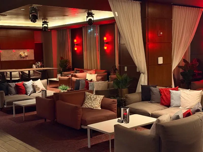 갓프리 루프탑의 첫인상은 그야말로 ‘환상적’이라는 단어로 요약할 수 있습니다. 은은한 붉은 조명이 감도는 실내는 아늑하면서도 세련된 분위기를 자아냈습니다. 마치 영화 세트장에 들어온 듯한 느낌이었습니다. 곳곳에 놓인 플랜트 장식은 도심 속 정원에 온 듯한 싱그러움을 더했습니다.