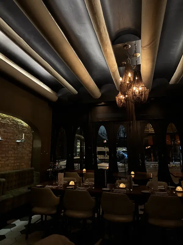 보카의 첫인상은 시각적으로도 매우 강렬했습니다. 이미지에서 보듯, 천장의 독특한 디자인과 은은하게 빛나는 샹들리에가 조화롭게 어우러져 고급스러우면서도 아늑한 분위기를 자아냅니다. 어두운 색조를 사용한 인테리어는 테이블 위의 음식을 더욱 돋보이게 하는 효과를 주어, 시각적인 즐거움까지 더했습니다. 벽돌 벽의 질감은 공간에 깊이를 더하고, 편안한 의자는 장시간 식사에도 불편함이 없도록 세심하게 배려한 흔적이 엿보입니다.