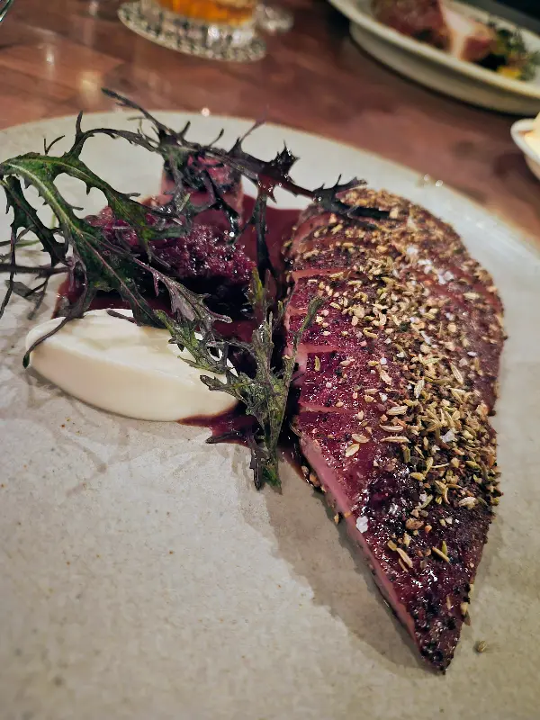 드라이 에이징 오리는 겉은 바삭하고 속은 촉촉한 완벽한 조리법으로 제 입맛을 사로잡았습니다. 드라이 에이징 과정을 거쳐 더욱 깊어진 풍미는, 지금까지 경험했던 오리 요리와는 차원이 달랐습니다. 곁들여진 소스와 채소는 오리의 풍미를 더욱 돋보이게 해주었습니다.