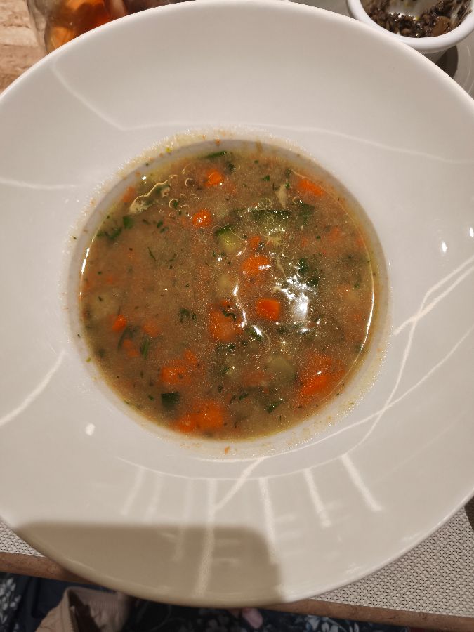 본격적인 식사에 앞서 애피타이저가 차려지기 시작했습니다. 첫 번째로 나온 호박 수프는 부드러운 목 넘김과 은은한 단맛이 어우러져 속을 편안하게 달래주었습니다. 따뜻하고 진한 풍미는 앞으로 나올 요리들에 대한 기대감을 한껏 높여주었습니다. 특히 잘게 썰린 당근과 허브가 어우러진 수프의 색감은 식욕을 자극하기에 충분했습니다.