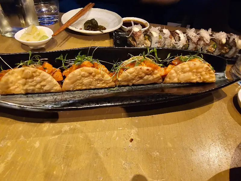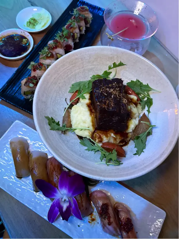 Mrs. Fish는 독특한 인테리어만큼이나 개성 넘치는 메뉴를 자랑합니다. 메뉴판에 적힌 다소 특이한 스시 조합들은 호기심을 자극하고, 실제로 맛을 보면 그 맛에 놀라게 됩니다. 연어 카르파초, 성게 파스타, 그리고 “The Oyabun”(랍스터 + 와규 소고기 + 아보카도) 등 다채로운 메뉴는 Mrs. Fish가 단순한 스시 레스토랑이 아닌, 미식 경험을 선사하는 공간임을 보여줍니다. 한 손님은 “제가 이보다 더 많은 해산물을 먹어본 건 AYCE에서 처음이었어요. 멈출 수가 없었어요.”라며 Mrs. Fish의 해산물 요리에 대한 극찬을 아끼지 않았습니다.
