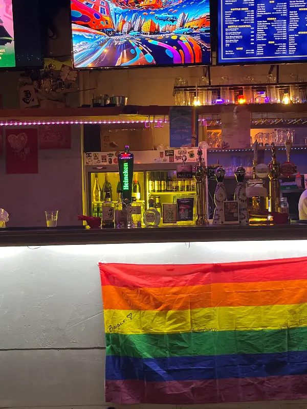 킹 도쿄의 첫인상은 강렬했습니다. 멀리서도 눈에 띄는 무지개 깃발이 이곳이 어떤 곳인지 상징적으로 보여주는 듯했습니다. 문턱을 넘어서자, 예상과는 달리 다양한 사람들이 어우러져 자유로운 분위기를 만끽하고 있었습니다. 게이 바(Gay Bar)라는 선입견은 잠시 접어두세요. 이곳은 성별, 나이, 성적 지향에 상관없이 모두가 환영받는 열린 공간입니다. 사진에서 보이는 것처럼, 바 테이블 위에는 다양한 종류의 술들이 가지런히 놓여 있었고, 은은한 조명은 아늑함을 더했습니다. 벽면에 걸린 화려한 장식들은 킹 도쿄만의 독특한 개성을 드러내고 있었습니다.