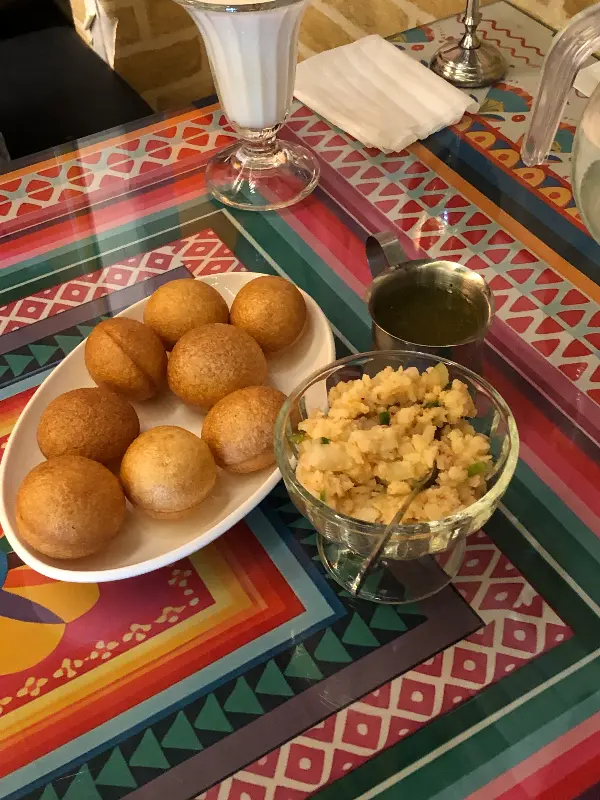 고민 끝에 가장 먼저 주문한 메뉴는 파니푸리였습니다. 평소 인도 음식을 즐겨 먹는 친구가 강력 추천했던 메뉴였기에, 그 맛이 더욱 궁금했습니다. 드디어 테이블 위에 올려진 파니푸리의 모습은 정말 독특했습니다. 작은 공 모양의 빵 안에 감자와 향신료로 속을 채우고, 새콤달콤한 소스를 곁들여 먹는 음식이라고 합니다.