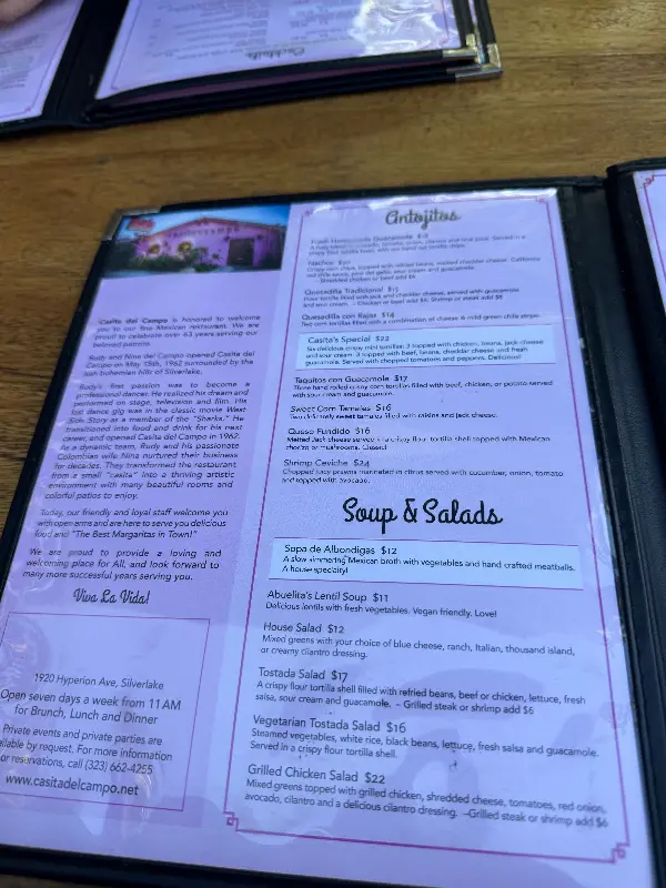 카시타 델 캄포는 LA 현지인들이 즐겨 찾는 숨겨진 보석 같은 곳입니다. 훌륭한 음식, 친절한 서비스, 아름다운 분위기는 이곳을 특별하게 만듭니다. 완벽한 맛을 추구하는 미식가에게는 약간 아쉬울 수 있지만, 편안하고 따뜻한 분위기 속에서 맛있는 멕시코 음식을 즐기고 싶은 사람들에게는 최고의 선택이 될 것입니다. 다음에는 꼭 매콤한 마가리타와 살사, 과카몰리 칩스를 맛보러 다시 방문해야겠습니다.