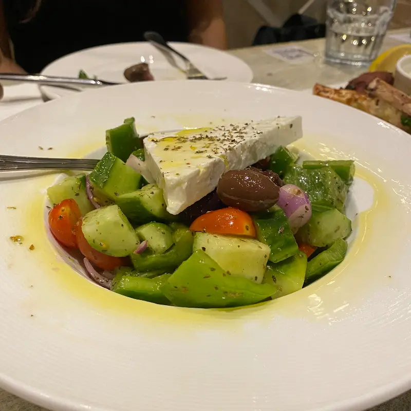 다음으로 맛본 ‘Prawn Manestra’는, 새우의 풍미가 가득한 리조또였습니다. 쌀 대신 ‘Orzo’라는 파스타 면을 사용했는데, 쌀과는 또 다른 쫄깃한 식감이 인상적이었습니다. 새우의 신선함과 고소한 풍미가 Orzo 면과 환상적인 조화를 이루었죠. 그리스 전통 샐러드는 신선한 채소와 올리브, 페타 치즈가 어우러져 상큼하고 깔끔한 맛을 선사했습니다.