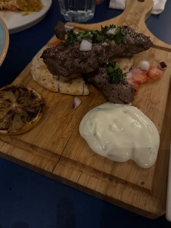 드디어 기다리고 기다리던 음식이 테이블 위에 놓였습니다. 먼저, 푸짐한 양의 미트 플래터가 눈길을 사로잡았습니다. 양고기, 소고기, 닭고기 등 다양한 종류의 고기가 먹음직스럽게 구워져 나왔죠. 곁들여 나온 소스에 찍어 한 입 맛보니, 입 안 가득 퍼지는 육즙과 풍미가 황홀했습니다. 특히 양고기는 특유의 잡내 없이 부드럽고 맛있었습니다.