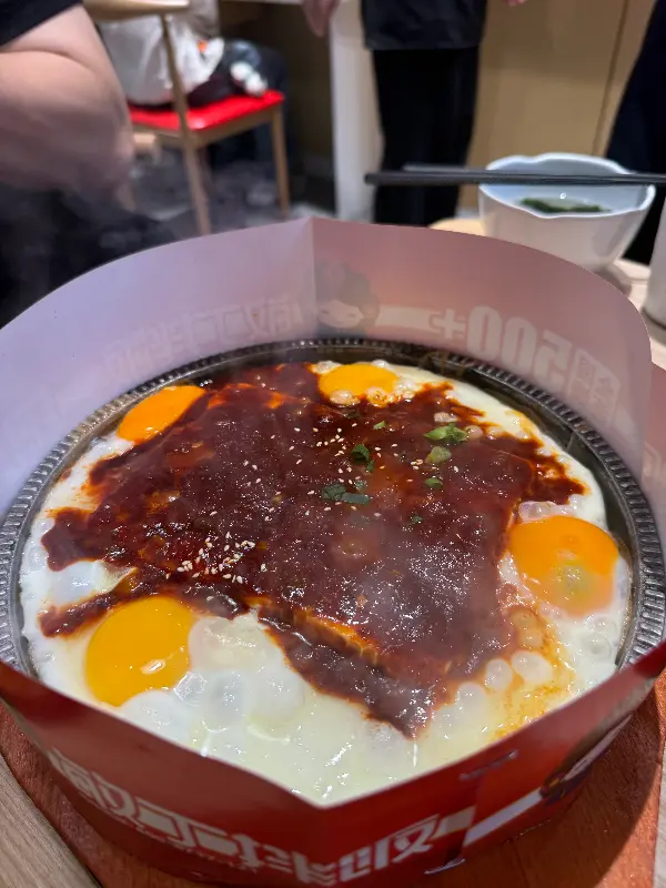 철판 계란 두부는 따뜻한 철판 위에 계란과 두부가 함께 구워져 나오는 메뉴였습니다. 계란의 고소함과 두부의 부드러움이 잘 어울렸습니다. 특히 함께 제공되는 양념장에 찍어 먹으니, 더욱 맛있었습니다. 철판 덕분에 음식이 식지 않고 따뜻하게 유지되는 점도 좋았습니다.