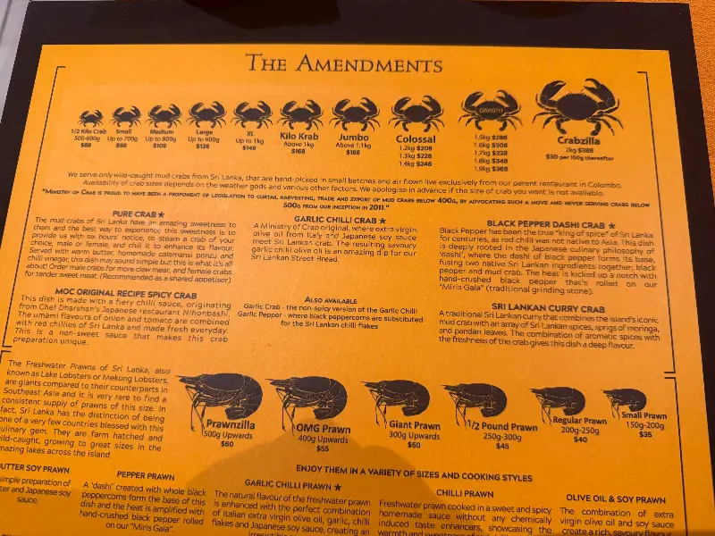 편안한 부스 자리에 앉아 메뉴를 살펴보았다. 매니저 도미닉의 친절한 설명과 추천 덕분에 메뉴 선택이 한결 수월했다. 그는 우리의 취향을 꼼꼼히 묻고, 그에 맞는 메뉴를 제안해 주었다. 이런 세심한 서비스는 Ministry of Crab의 큰 장점 중 하나다.