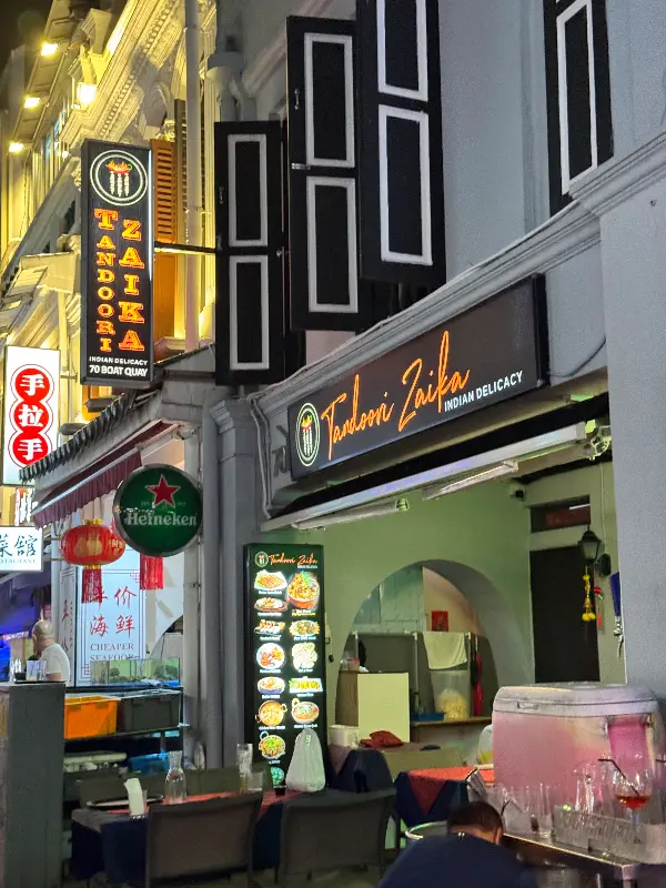 탄두리 자이카의 외관은 싱가포르의 밤거리와 어우러져 더욱 매력적인 분위기를 자아낸다. 간판의 따뜻한 조명이 편안함을 더하며, 인도 요리의 향긋한 향신료 냄새가 발길을 멈추게 한다.