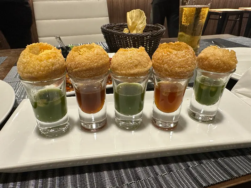 색색깔의 향이 나는 물이 담긴 샷잔과 함께 제공되는 Pani Puri는 시각적으로도 즐거움을 선사한다. 바삭한 푸리를 살짝 깨뜨려 향긋한 물을 채워 넣으면, 입안 가득 퍼지는 상큼함과 매콤함이 잊을 수 없는 경험을 선사한다.