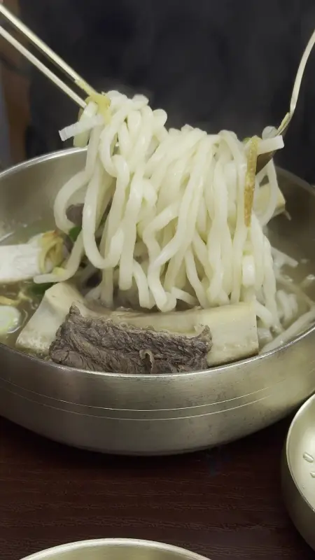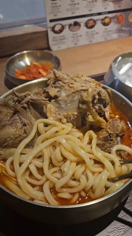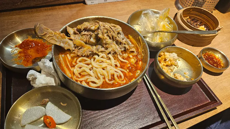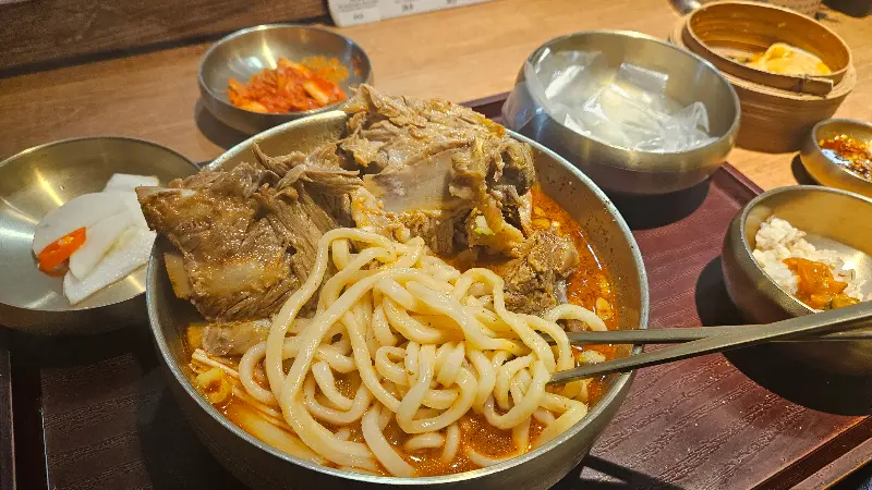 국물부터 한 입 맛보니, 깊고 진한 육향이 온몸을 감싸는 듯했다. 오랜 시간 정성껏 끓여낸 육수에서 우러나오는 깊은 맛은, 단순히 칼국수 한 그릇을 넘어 보양식을 먹는 듯한 느낌을 선사했다. 면발은 쫄깃하고 탱탱했으며, 육수와 환상적인 조화를 이루었다. 등뼈에 붙은 살코기는 부드럽고 촉촉했으며, 뼈에서 쉽게 분리되어 먹기에도 편리했다.