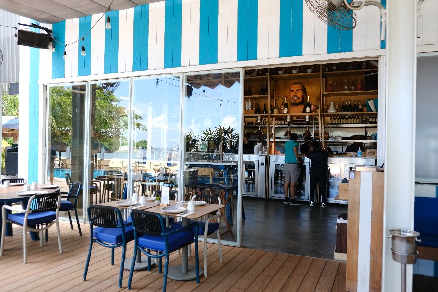 탄종비치클럽은 단순히 식사를 하는 곳이 아니라, 그 자체로 하나의 거대한 힐링 공간이다. 맑고 푸른 하늘 아래, 하얀 모래사장 위로 깔린 나무 데크는 클럽의 메인 공간으로 이어진다. 여기저기 배치된 푹신한 소파와 라탄 의자는 지나가는 이들의 발길을 붙잡고, ‘잠시 쉬어가라’고 속삭이는 듯하다. 실내 공간은 시원한 푸른색과 흰색 줄무늬 벽면이 시선을 사로잡으며, 투명한 유리문 너머로 드넓은 바다가 한눈에 들어와 개방감을 더한다. 높은 천장에는 빈티지한 감성의 팬이 돌아가며 시원한 바람을 선사하고, 은은한 조명은 저녁이 되면 더욱 아늑한 분위기를 연출한다.
