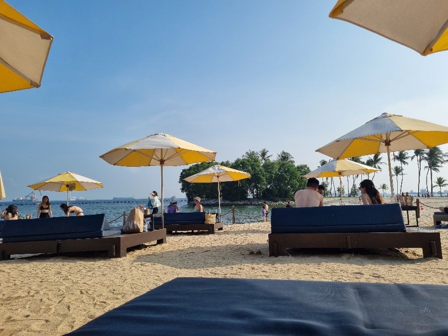 수영을 즐기기에 다소 미지근하고 지저분했던 센토사 해변의 아쉬움을 뒤로하고, 탄종비치클럽에 도착했을 때의 그 해방감이란! 푸른 바다를 배경으로 펼쳐진 이국적인 풍경은 방문객의 마음을 단번에 사로잡는다. 해변을 따라 줄지어 선 오렌지색 파라솔과 푹신한 선베드, 그리고 그 너머로 보이는 야자수와 시원하게 펼쳐진 수영장은 마치 해외 휴양지에 온 듯한 착각을 불러일으킨다. 평일에 방문하면 예약 없이도 선베드에서 여유롭게 시간을 보낼 수 있다는 점은 이곳의 큰 매력 중 하나다. 뜨거운 태양 아래 시원한 칵테일 한 잔을 기울이며, 잔잔한 파도 소리를BGM 삼아 완벽한 휴식을 만끽하는 상상, 바로 그곳이 탄종비치클럽이다.