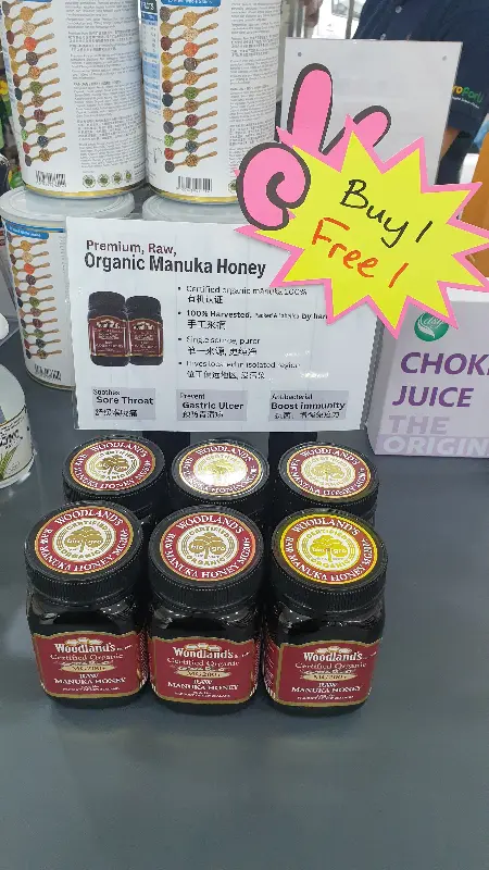 시식 코너에서 만난 유기농 마누카 꿀. 고급스러운 패키지와 ‘Buy 1 Free 1’ 마크가 눈길을 사로잡습니다.
